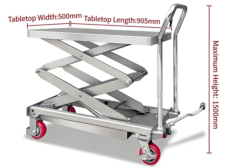 Vor jedem Einsatz des 350 kg schweren hydraulischen Hubwagens aus Edelstahl: Überprüfen Sie die Plattform und die Scherenarme auf Verformungen und Risse und stellen Sie sicher, dass alle Schrauben fest sitzen. Überprüfen Sie, ob sich die Räder reibungslos drehen und die Bremsen wirksam sind. Führen Sie zwei bis drei Hebevorgänge ohne Last durch, um sicherzustellen, dass der Hebevorgang stabil ist, kein Öl austritt und der Abstieg kontrollierbar ist.